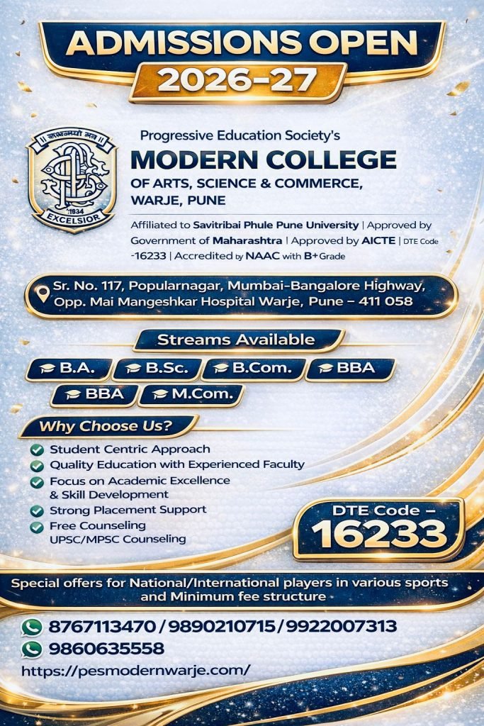 On behalf of Progressive Education Society’s Modern College of Arts,Science and Commerce, S.No. 117, Popularnagar, Warje, Pune. I heartily welcome you all!!! P. E. Society’s MCASC was founded with the vision, “To provide excellent educational opportunities to the students to meet economic social and environmental challenges to become active participant in shaping the world of future we see.” Modern College Arts, Science and Commerce (MCASC) Warje, Pune 58 was started in 2019. By Progressive Education Society, Pune in Maharashtra. PES is Founded in 1934. It is based on the Pedstal ज्ञानमयो भव (Dnyamayo Bhav) meaning “Be knowledge incarnate” as envisaged by the visionaries, who then established the PES Pune, entire functioning of the college rests on two key words ...Read More